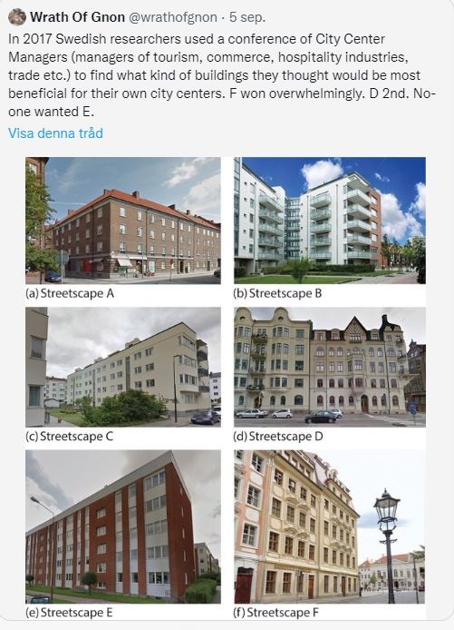 Ny studie: Klassisk stil dominerar Swedish survey in 2024 by SOM-institute showing that 66% of public prefer classical architecture to modernist architecture.